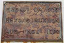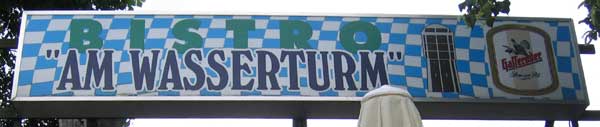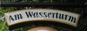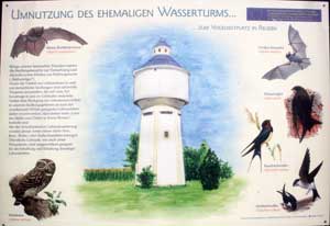 The headline on the sign at the water tower: UMNUTZUNG DES EHEMALIGEN WASSERTURMS ... ZUM VOGELNISTPLATZ IN REUDEN [The former water tower in Reuden has now get a new function ... as a place for bird nest] |