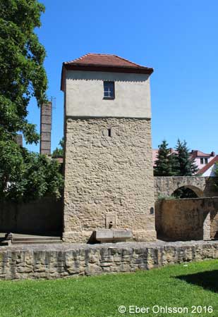 | The head of the Stadtarchiv Naumburg, Susanne Kröner had kindly submit materials confirming that the tower Wasserkunst once had been a water tower. Walter Wirth in LDZ 1986-01-30: "Am Ende des 17. Jahrhunderts, 1698, wurde die sogenannte 'Wasserkunst' am Wenzelsring, am 'Pförtchen', angelegt. In dem mit einem Hebewerk versehenen Türmchen befand sich im 'oberen Stockwerk', 18 Ellen [10,5 meter] hoch, so berichtet die Chronik, ein großer steinerner Trog, der das in 'zwiefacher' Röhrenfarhrt kommende Wasser aufnahm. ..." |