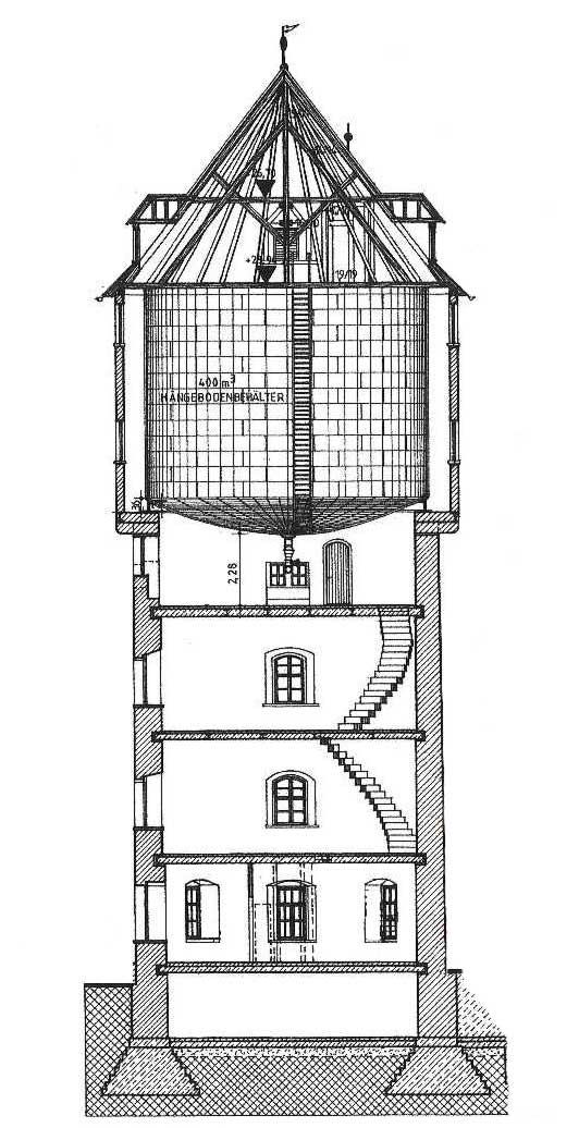 Den etwa 30 Meter hohen Turm, 1917 aus Stahlbeton auf einer armierten Fundamentplatte errichtet, schmückt eine halbkugelartige, mit Schiefer gedeckte Haube. Im Inneren ist die technische Ausstattung weitestgehend erhalten. Dazu gehören der Stahlbetonkessel mit einem Fassungsvermögen von 100 Kubikmeter Wasser, diverse Leitungen und eine Holztreppe bis zur obersten Plattform. Diese bietet Platz für etwa 30 Personen, die von hier aus beste Aussichtsmöglichkeiten auf Stadt und Umgebung haben.