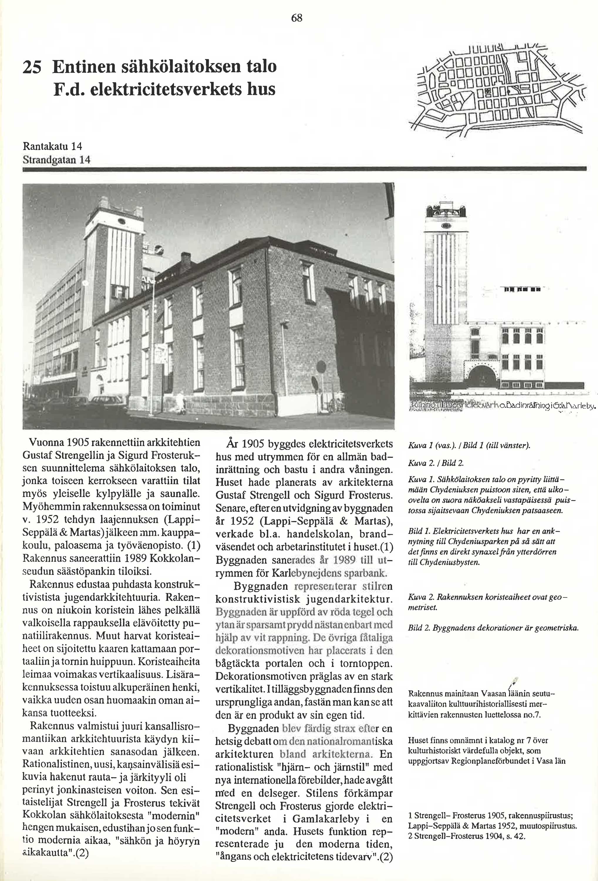 ![]() Click to Enlarge Faktablad om Gamlakarleby Badinrättnings och Elektricitetsverks byggnad, som i det höga tornet bland annat rymde en vattenbehållare. Kristina Ahmas: "Byggnadskultur och kulturlandskap i Karleby: inventering åren 1983-1991." Informationen är välvilligt ställd till förfogande av Erik Engberg, K.H.Renlunds museum - Mellersta Österbottens landskapsmuseum. |