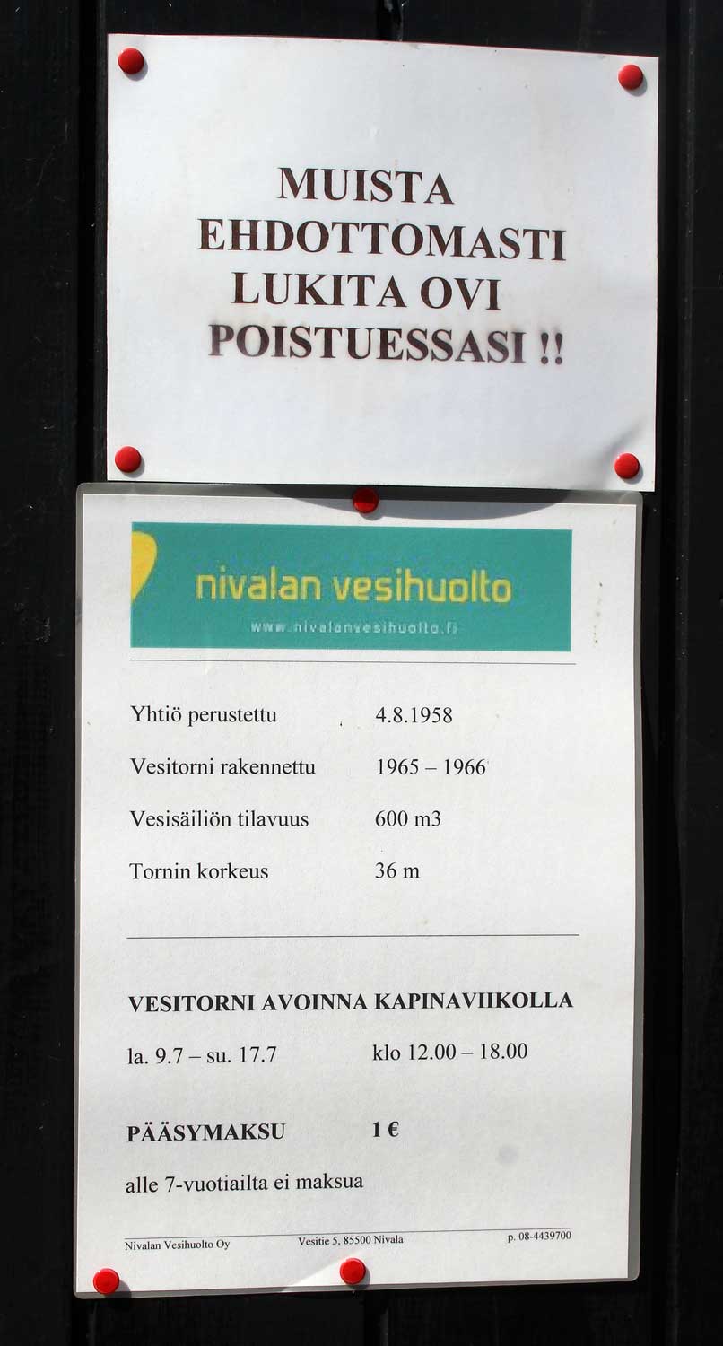 ![]() Click to Enlarge Make sure you lock the door when leaving!! Nivalan vesihuolto Company established: 1958 Water tower built: 1965-1966 Reservoir volume: 600 m³ Tower height: 36 m Opening hours: 9.7 - 17.7 [2016] 12.00-18.00 Entrance fee: 1 € Children under 7 years free |