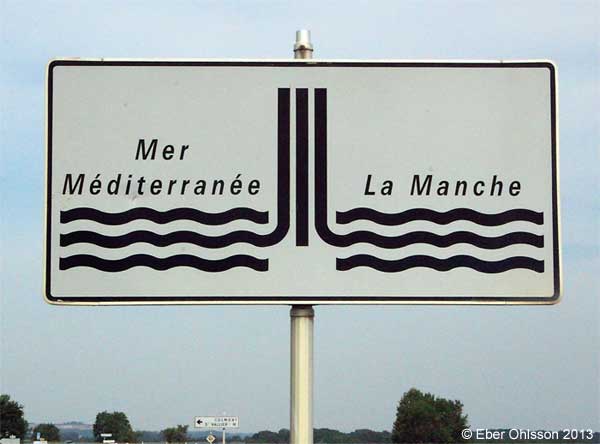 På väg E 54 i Frankrike, något närmare Basel än Paris, finns en vågad skylt som markerar vattendelaren mellan Medelhavet och Nordsjön.