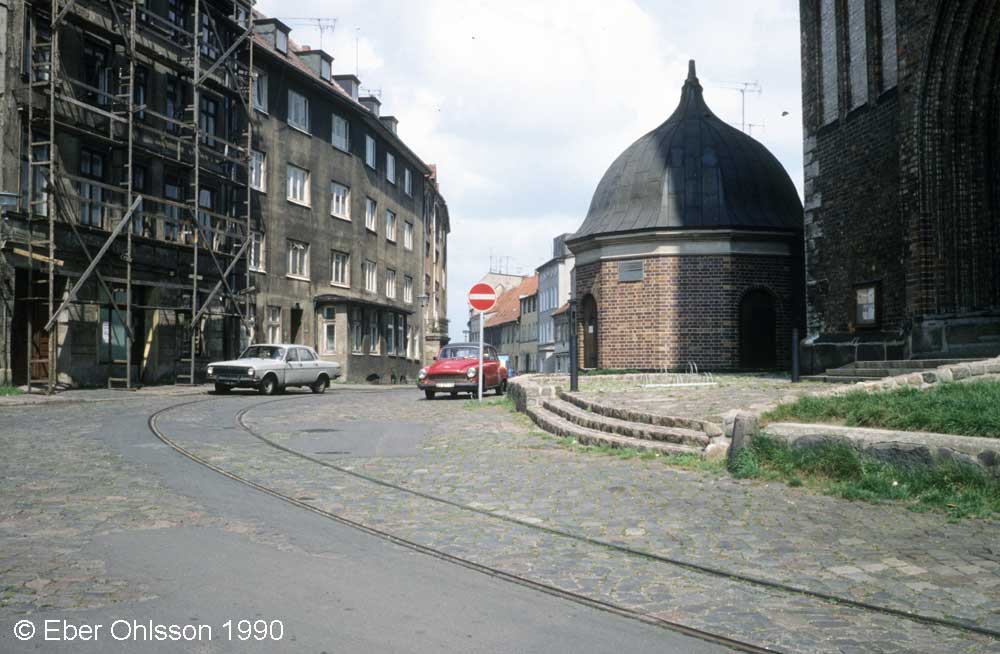 Från Steintor följde processionen den breda vägen och de breda spårvägsspåren (1440 mm) förbi Neuer Markt, denna söndag fortfarande namnsatt Ernst-Thälmann-Platz, stadens Rathaus och vek av där spåren går i kurva förbi Marienkirche. Spår med en ovanligt god elevation för att vara i centrala staden.