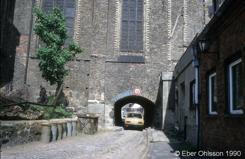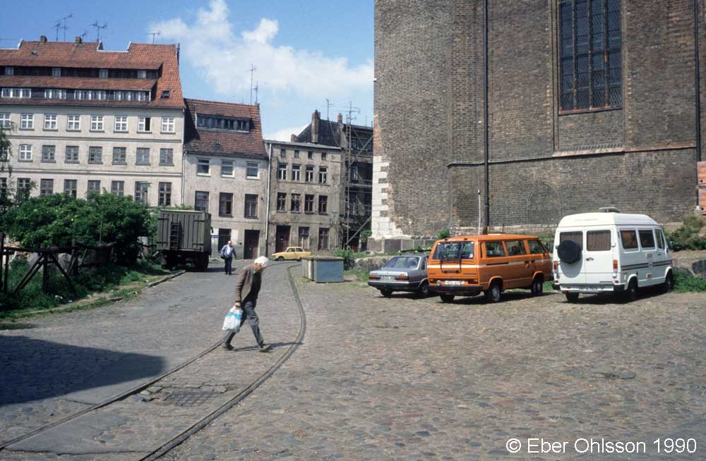 I denna lågformation gick spår som förband hamnen med Rostocks bangård. Längre fram passerades Franciskanerklostret S:t Katharinen. Klostret som de gångna årens regim svärtat ner. Inne i korsgången bland raserade murar återfanns ett kolupplag.